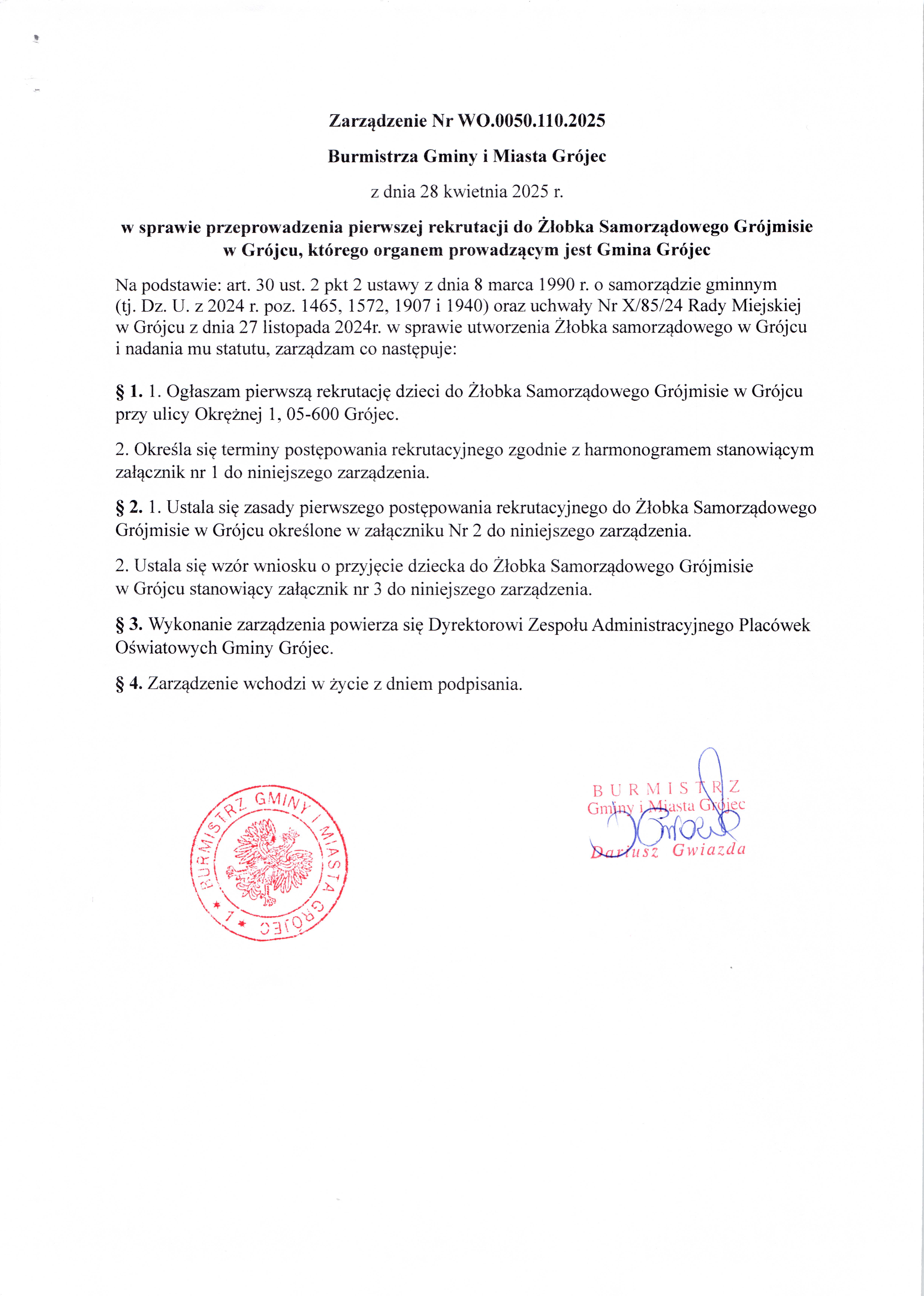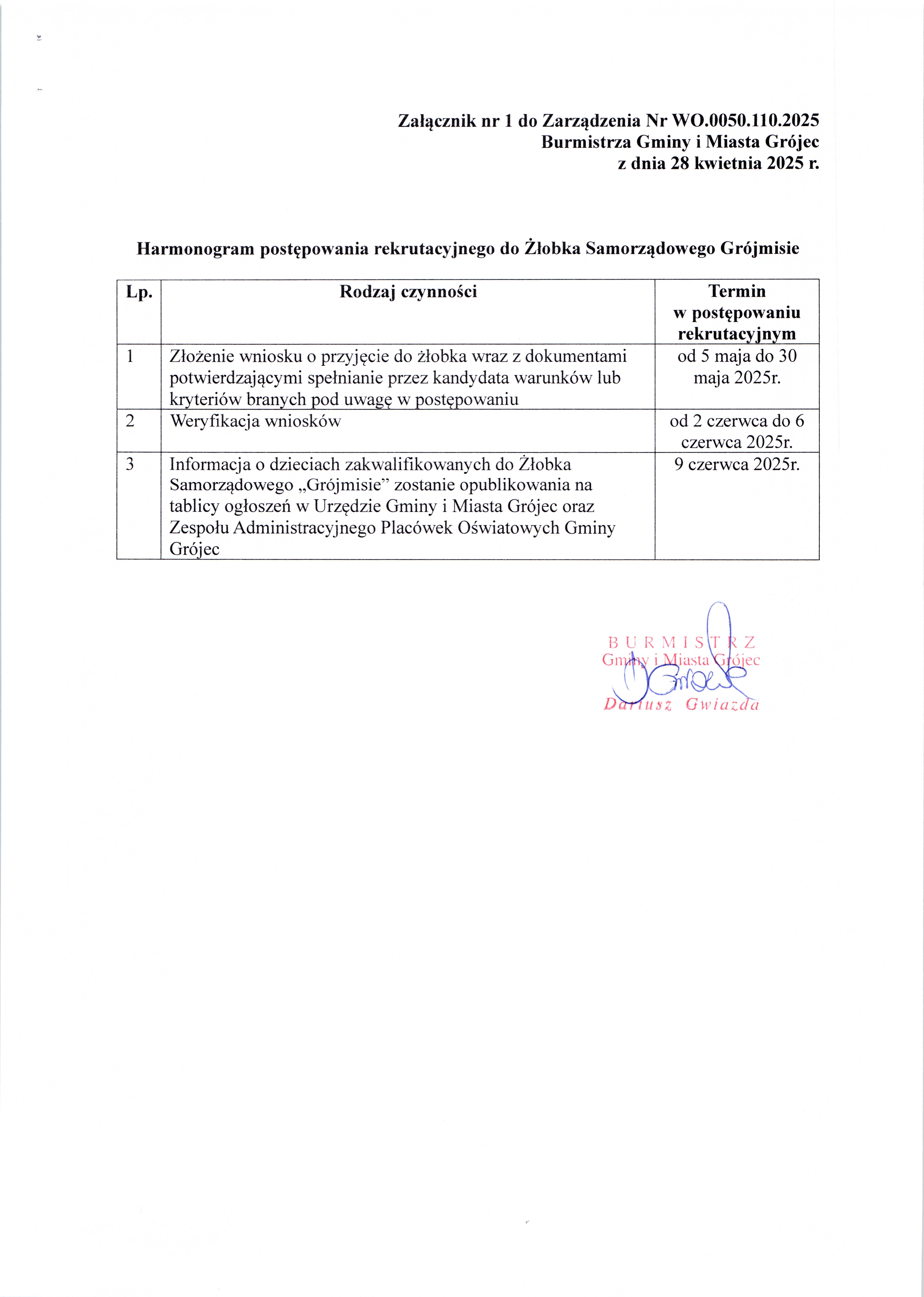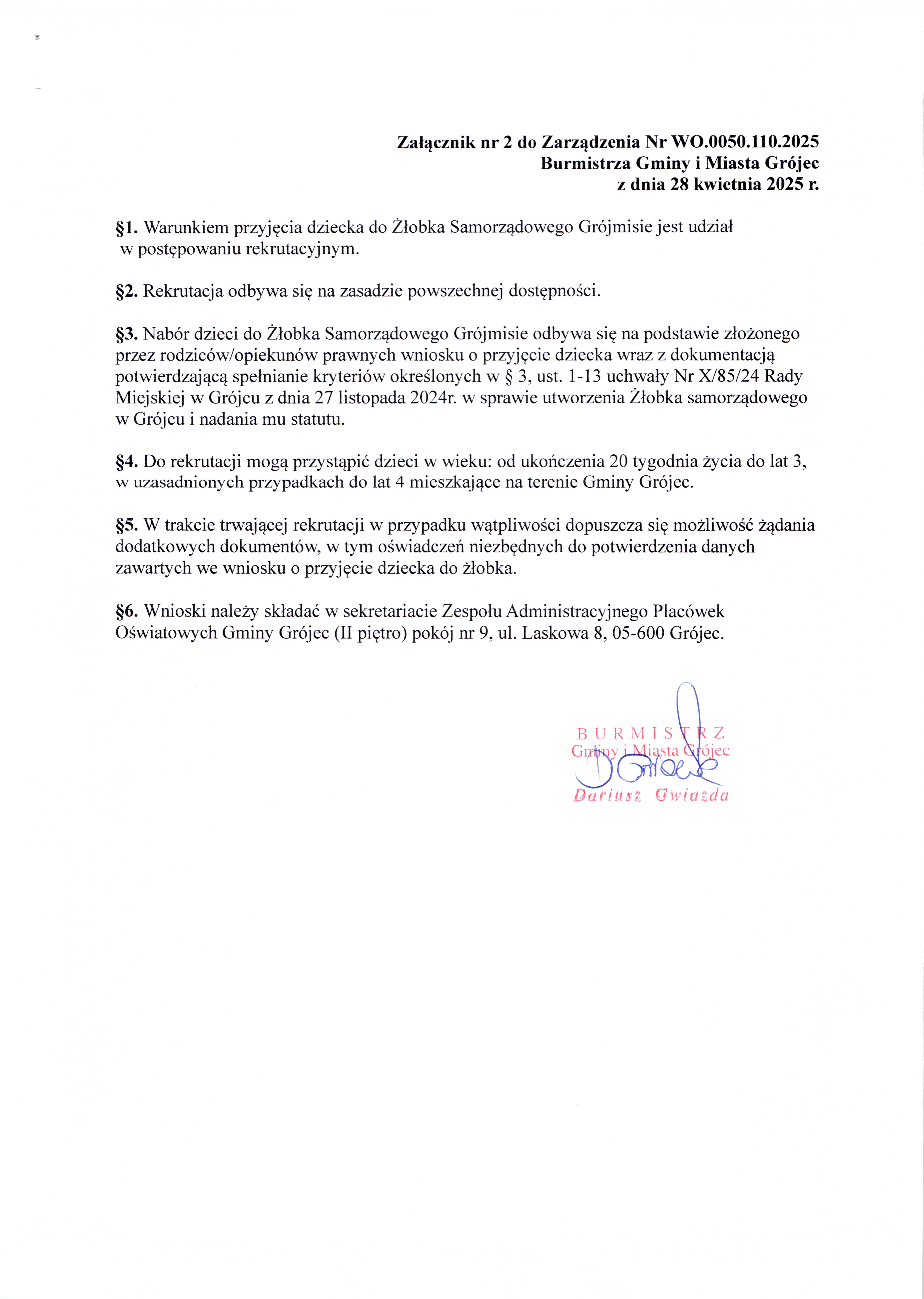 Szczegółowe informacje dot. postępowania rekrutacyjnego, terminarz oraz wniosek wraz z załącznikami znajdują się w Zarządzeniu Nr WO.0050.110.2025 Burmistrza Miasta i Gminy Grójec.